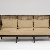 Handcrafted of rattan with solid mahogany base. Down and fiber seat & back cushions.